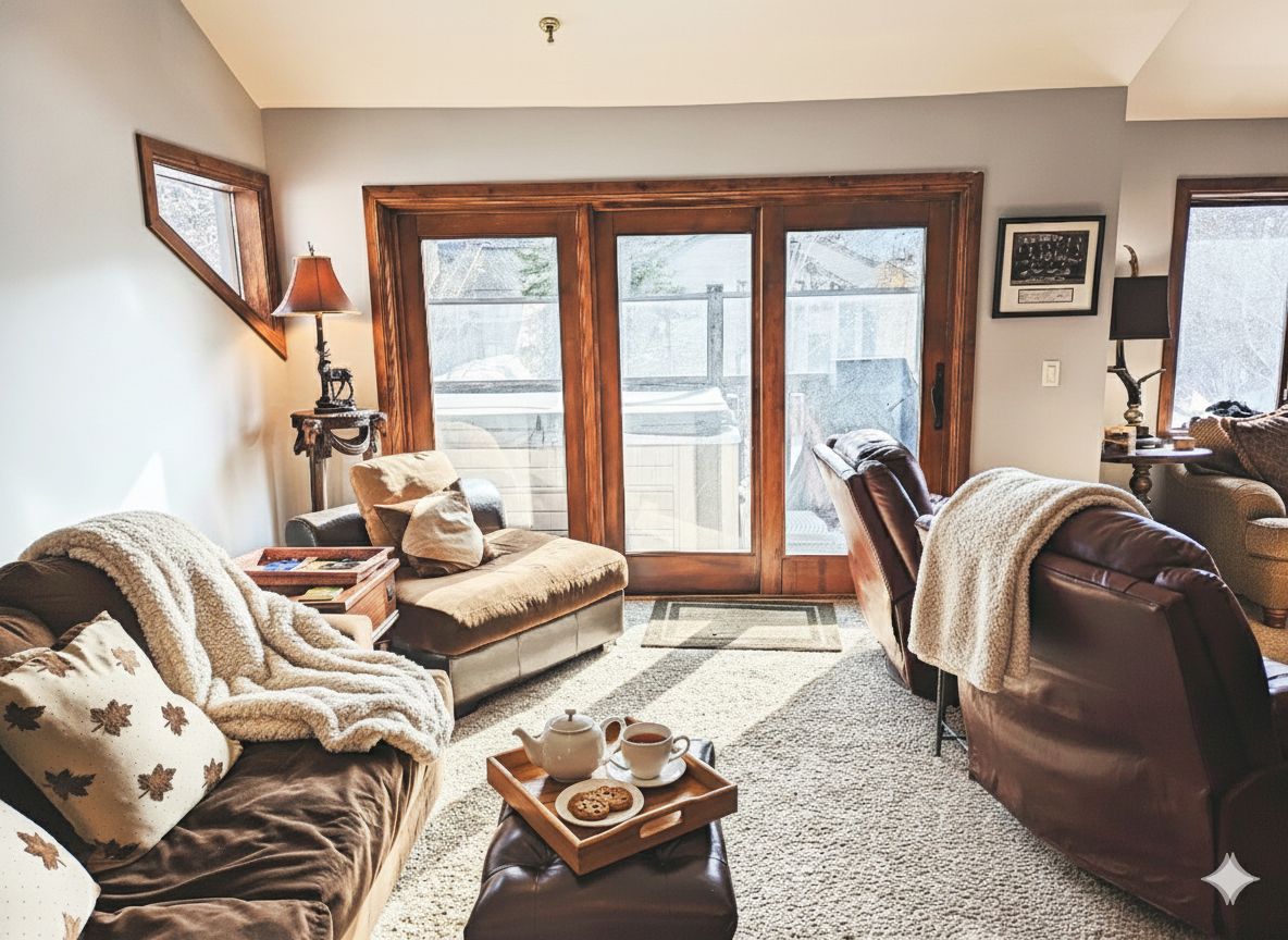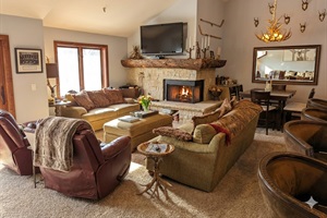 Cozy up next to the large stone corner gas fireplace or warm up in the 6 person private hot tub on the deck after a chilly day of skiing or exploring the endless mountain biking and hiking trails in the area. The carpeted living room area has ample seating for your entire group with multiple couches and recliners and a TV above the fireplace. High speed internet is available via Wifi throughout the entire condo.