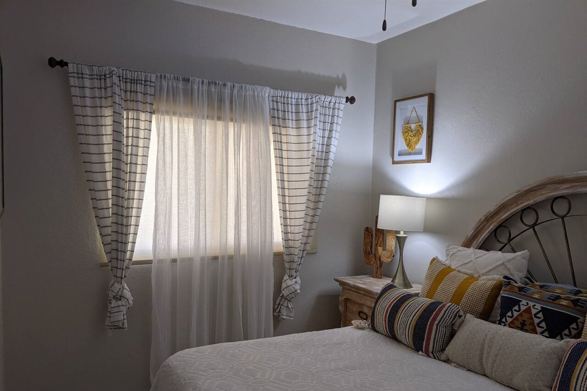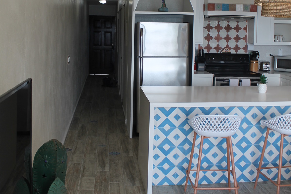 Kitchen with a Mexican-Surfy Vibe. Fully equipped with most things you should need including a bonus beverage refrigerator!