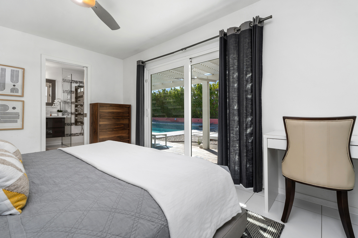 We have a full kitchen with large island and seating that overlooks the pool and backyard area. The white quartz contertops add a clean touch to the modern and open kitchen. We will have some coffee for your morning wake-up call and to get your day started exploring the Palm Springs area!