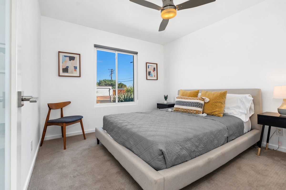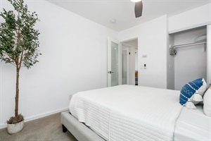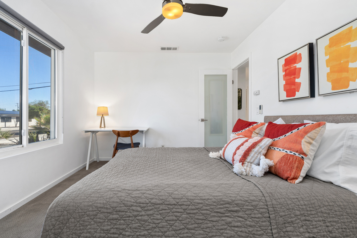 There are 4 bedrooms. The master bedroom has a king size bed with ensuite bathroom and clothing storage. It also has a sliding door out to the backyard/pool area.