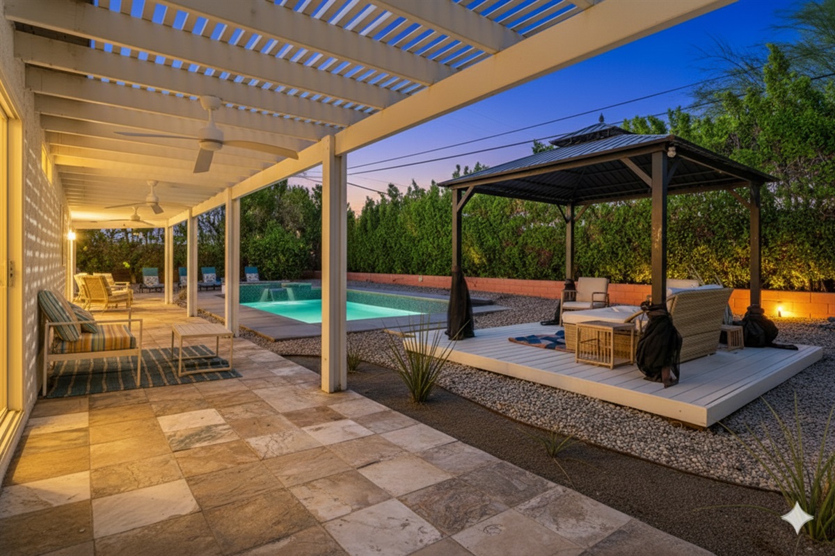 Come cool off from the desert heat in our year round pool. In the cooler months, the pool can be heated at your request! (please let us know at least 3 days before your stay that you would like the pool heated). Then jump into our attached hot tub when you want to warm up and relax! We have some pool toys and loungers to enjoy the warm desert sun. You can also cool off and relax in our seating area under the gazebo with misters for those hot summer days! Dine in (side the home) or in our backyard dining area. You can grill out on our propane bbq or cook to your heart's delight in our fully quipped kitchen overlooking the backyard area!