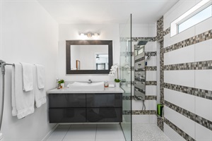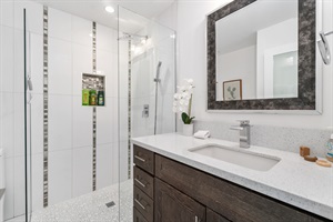 Both bathrooms have clean & modern decor, walk-in showers and vanity storage. We provide basic toiletries and towels in both bathrooms for your use!